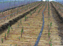 植付けから1週間、すくすく育つ私たちですが、土の上に敷かれている物は「泥跳ね避けの藁」で、病気や葉の汚れなどを防止してくれます。
