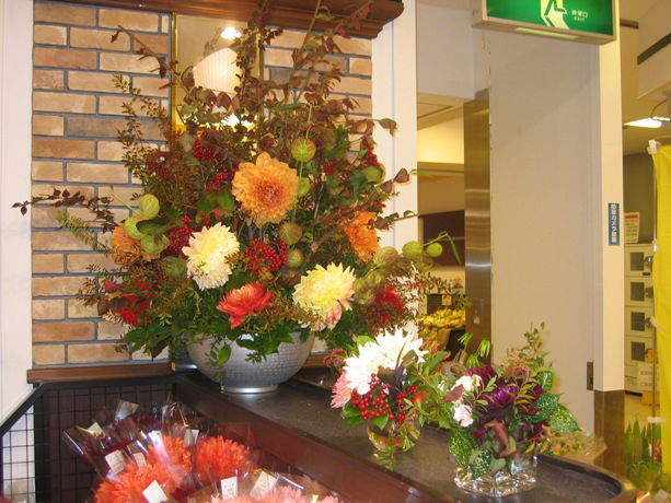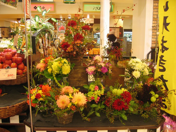 | 組合せ販売について | 今回は、スリーブ入りの花束だけでなく、「花と葉物との組合せ例」として、花瓶と花束の組合せ販売を行ってみたが、これも好評で、実際の商品としても販売出来たが、お客様自身が葉物や枝物との組合せをその場で楽しまれ、購買に結び付けられたのは良かったと思う。 |